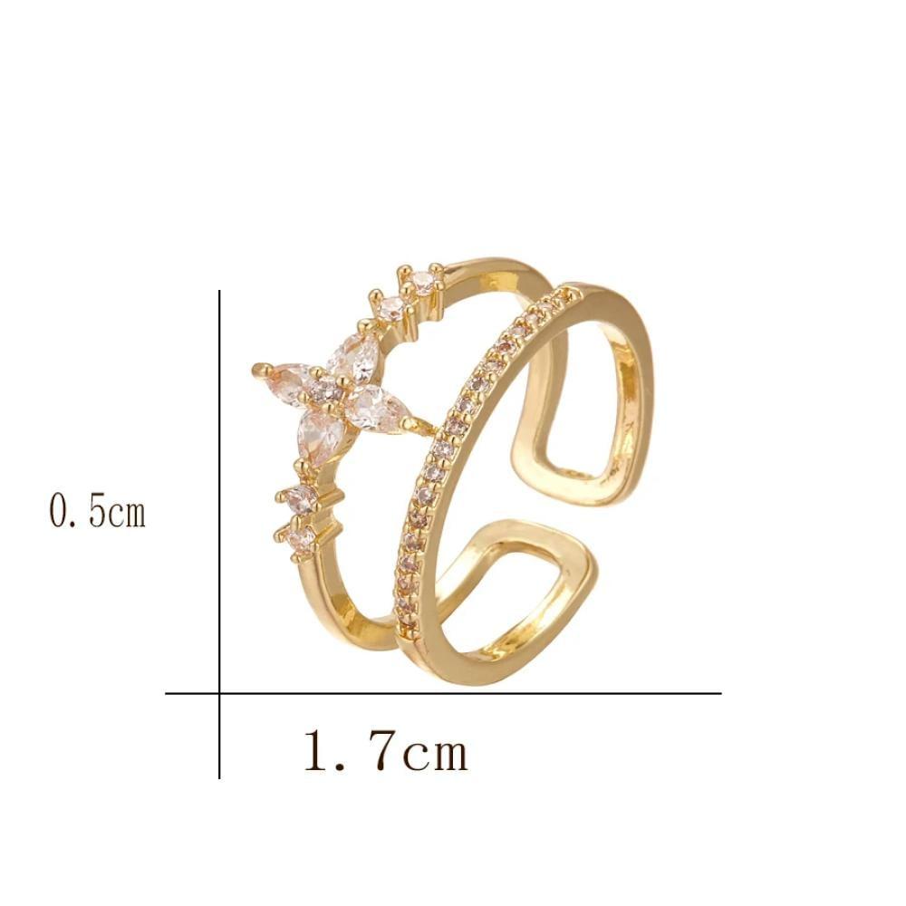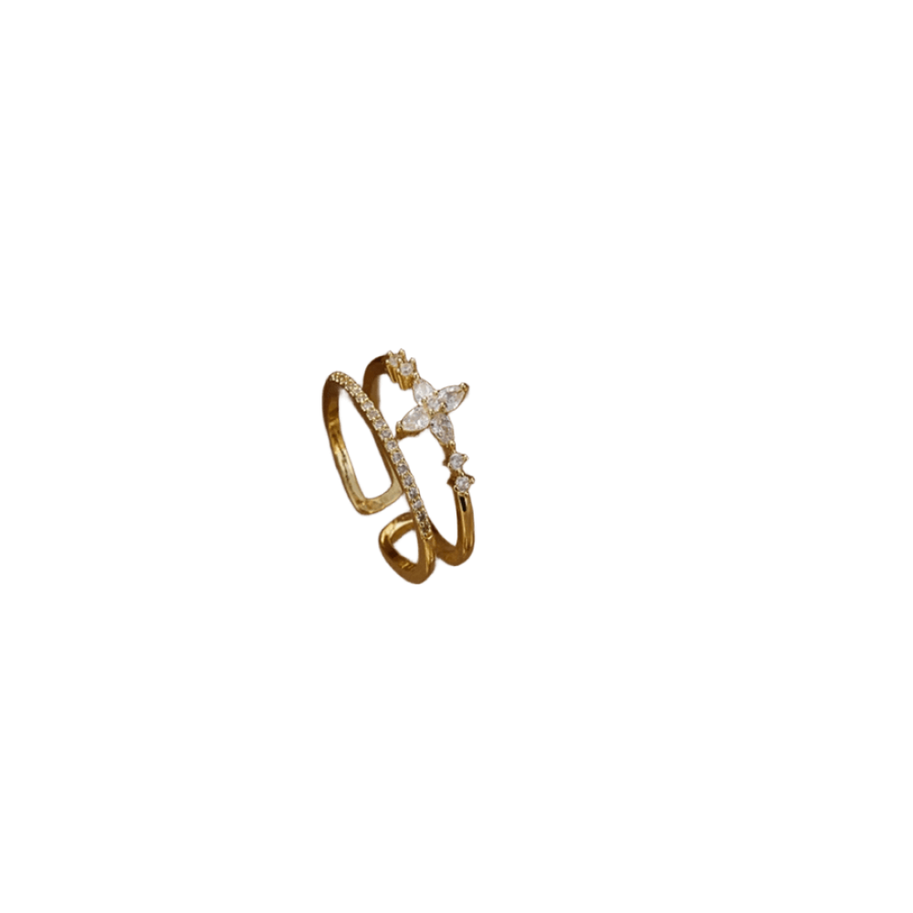 خاتم نسائي فاخر بتصميم متقاطع مزدوج، مصنوع من الفولاذ المقاوم للصدأ ومطلي بالذهب، مزين بحبيبات الزركون اللامعة. خيار مثالي للزفاف أو كهدية أنيقة للأزواج، يجمع بين الجاذبية والجمالية العصرية.