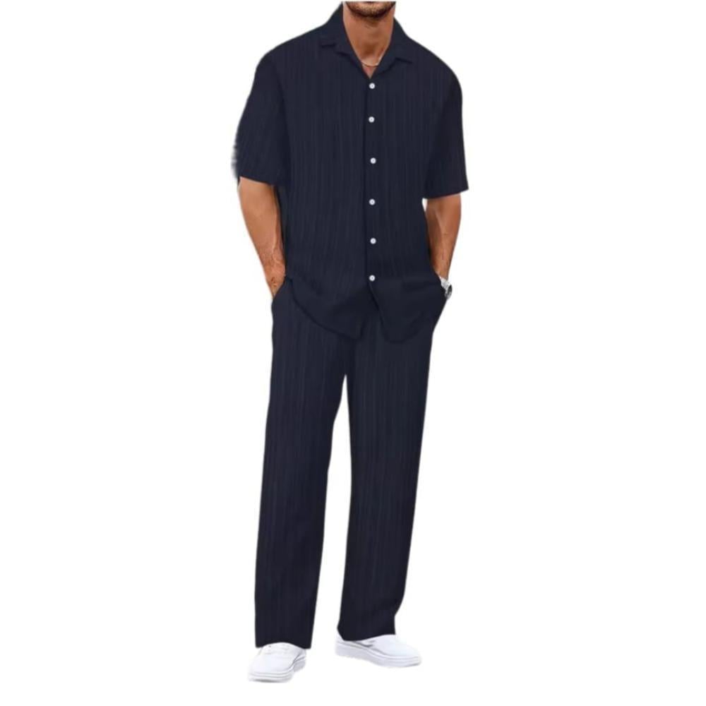 القميص بتصميم كلاسيكي مع لمسة عصرية تناسب أجواء العمل والاجتماعات غير الرسمية، والبنطلون بقصة مريحة وأنيقة تضمن لك حرية حركة ومظهر متناسق.