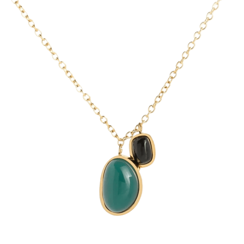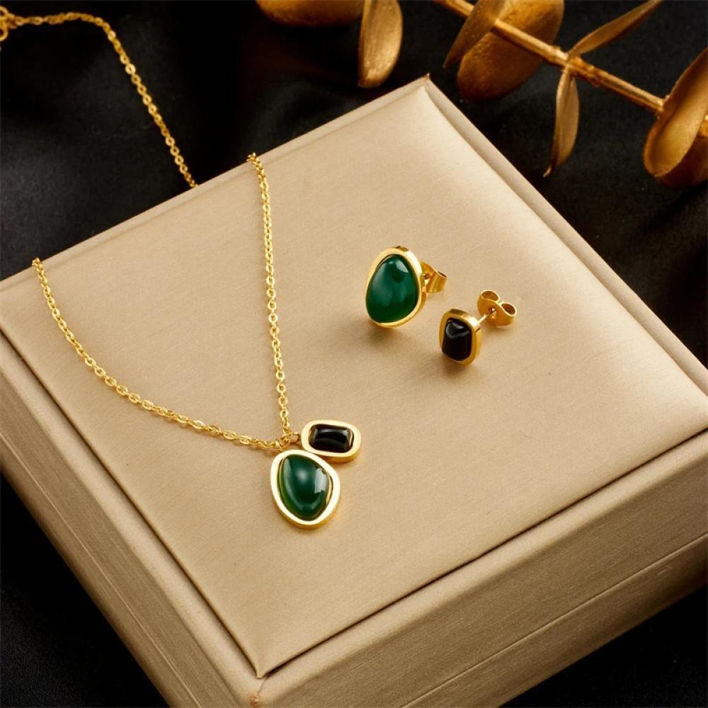طقم أنيق للنساء ، يضم قلادة وأقراط مصنوعة من الفولاذ المقاوم للصدأ 316L المقاوم للماء، ومزينة بأحجار خضراء وسوداء بلمسة راقية. مثالي للفتيات العصريات الباحثات عن الأناقة اليومية مع لمسة فريدة.