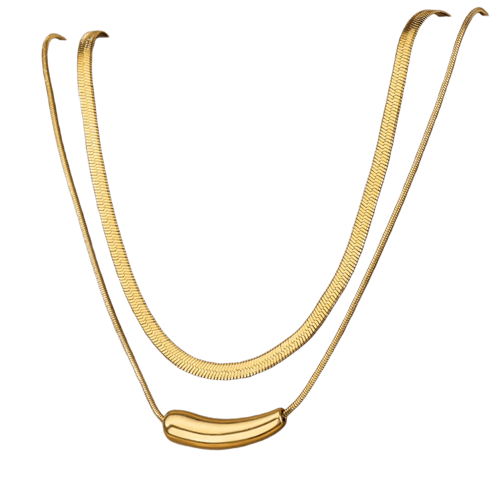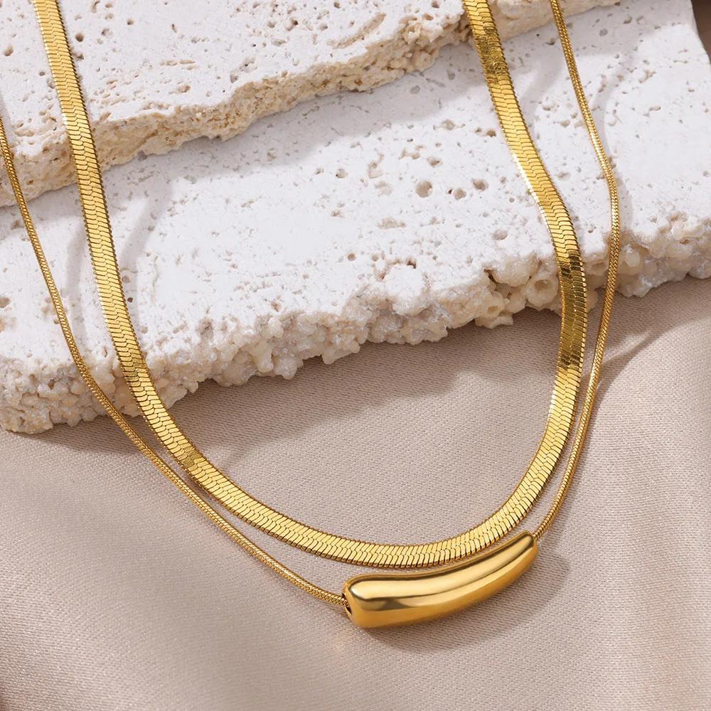 قلادة أنيقة بطبقتين للنساء، مصنوعة من الفولاذ المقاوم للصدأ بلون ذهبي لامع، مع قلادة مركزية بتصميم مائي مكتنز يلفت الأنظار. قطعة فاخرة وعصرية مثالية كهدية أو لإطلالة جريئة وأنيقة.